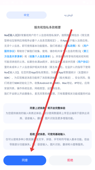 1、在打開Nur輸入法app后,通過點擊同意按鈕,隨即進入使用。