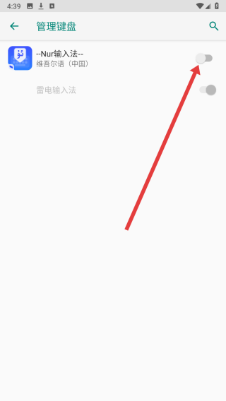4、跳轉(zhuǎn)到管理鍵盤頁面中,可以點擊右側(cè)開關(guān)按鈕添加Nur輸入法。
