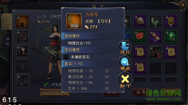 角色具有10處裝備部位,分別為:武器,頭盔,衣服,鞋子,護(hù)腕,腰帶,戒指,項(xiàng)鏈,手套,耳環(huán)。