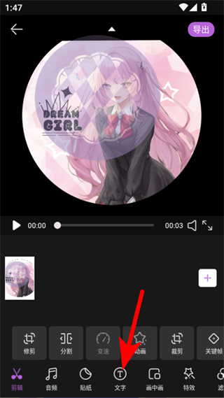 3、在編輯頁面,點(diǎn)擊底部的文字選項(xiàng),進(jìn)入文字添加界面。