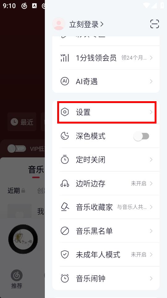 2、在彈出側(cè)邊欄中,點擊設(shè)置選項進入設(shè)置頁面。