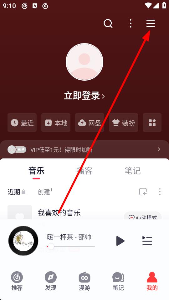 1、打開網(wǎng)易云音樂APP點擊我的,進入個人頁面后點擊右上角三條橫線圖標。