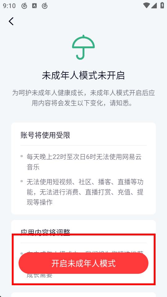 4、在未成年模式界面點擊下方開啟未成年人模式按鈕,按提示完成設(shè)置即可。