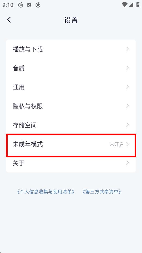 3、在設(shè)置頁面中找到未成年模式,點擊進入相關(guān)界面。
