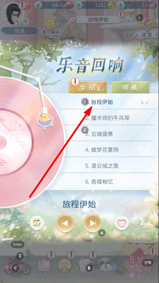2、進入樂音回響界面后,在呈現(xiàn)的歌曲列表里,瀏覽查找心儀歌曲,如列表中的旅程伊始,點擊對應(yīng)條目選定該歌曲。
