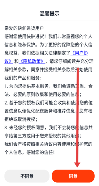 1、在打開App后點(diǎn)擊“同意”,進(jìn)入快驢進(jìn)貨首頁(yè)。