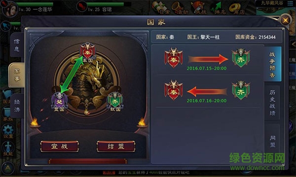 宣戰(zhàn)成功后,對備戰(zhàn)兩國所有角色彈出備戰(zhàn)提示框,備戰(zhàn)期間每次上線也將彈出備戰(zhàn)提示框。