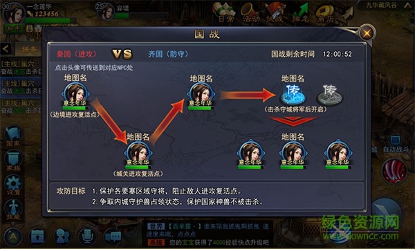 1.國戰(zhàn)開始,國戰(zhàn)專屬守衛(wèi)NPC(邊境、城關(guān)、王城)由無敵狀態(tài)刷新為可攻擊狀態(tài),歸屬方為防守方。