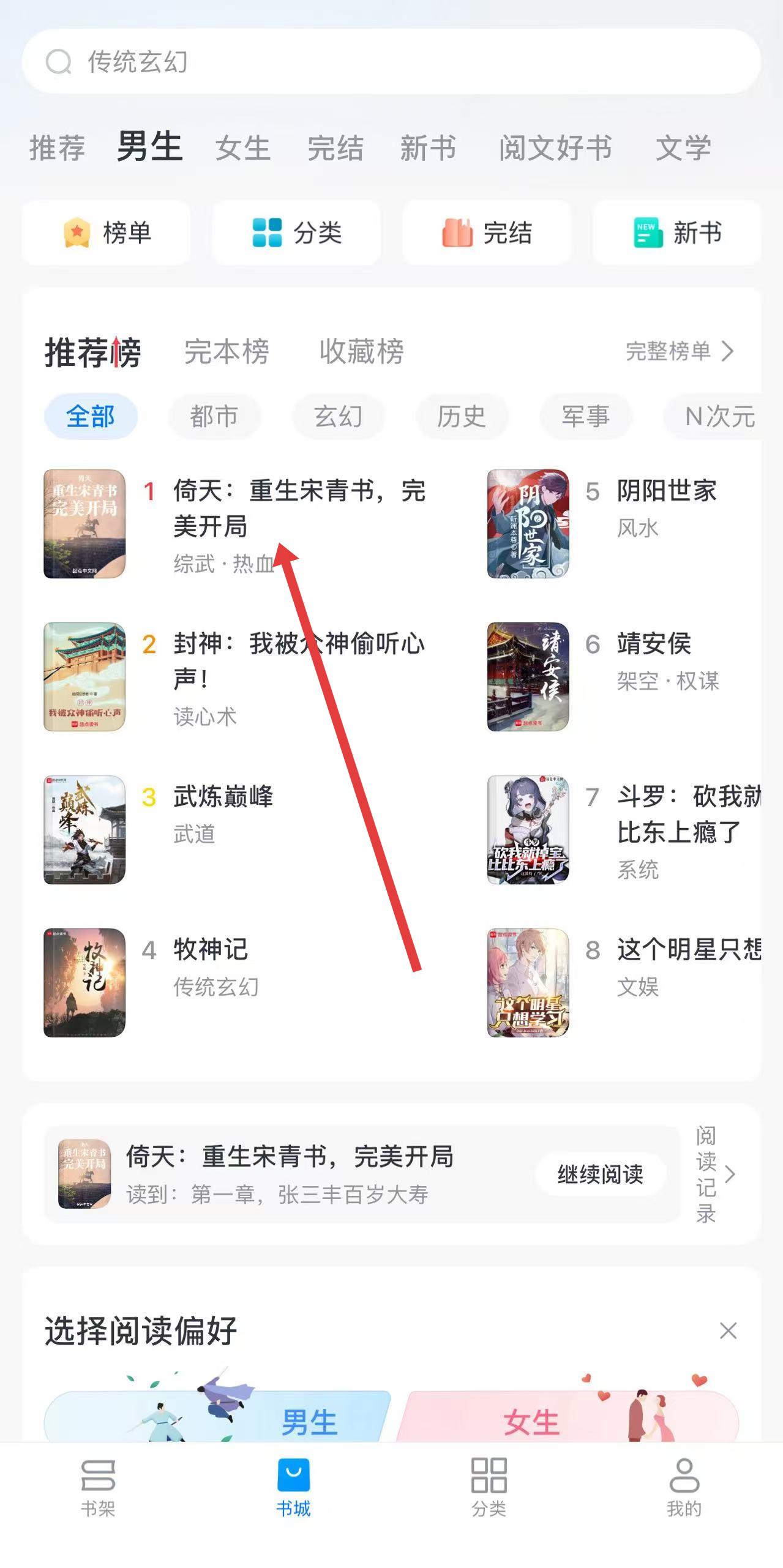 1、打開淘小說App,進入書城界面,在推薦榜等榜單中選擇想看的小說,比如點擊倚天:重生宋青書,完美開局。