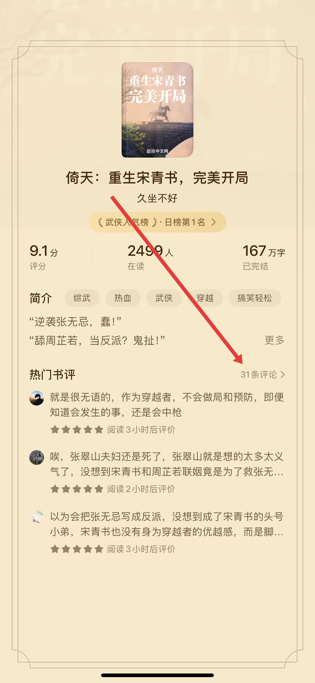 2、進入小說詳情頁面后,下滑找到熱門書評板塊,點擊右側(cè)xx條評論的選項,就能進入該小說評論區(qū)。