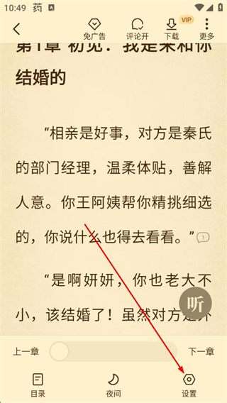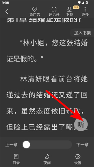 2、在小說閱讀界面,點擊右下角聽按鈕,進入聽書準備頁面。