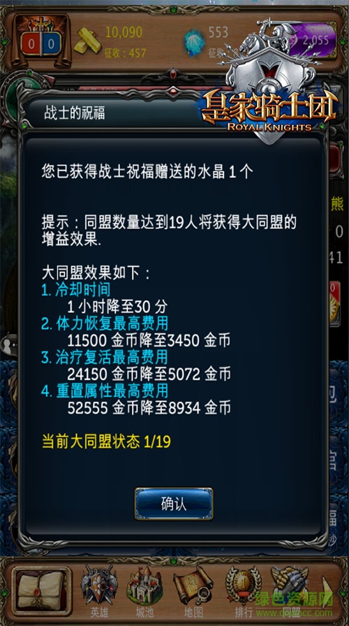 值得一提的是,在《皇家騎士團(tuán)》中締結(jié)同盟,不但可以在戰(zhàn)場(chǎng)上互相支援,演變出更豐富的戰(zhàn)術(shù)打法,還可以獲得同盟buff。游戲中,玩家每小時(shí)可在戰(zhàn)士祝福中獲得水晶,當(dāng)同盟人數(shù)到達(dá)最大值時(shí),戰(zhàn)士的祝福冷卻時(shí)間、體力恢復(fù)、治療復(fù)活和重置屬性的最高費(fèi)用都會(huì)下降。這些都將成為你攻城略地,征戰(zhàn)四方的極大助力。