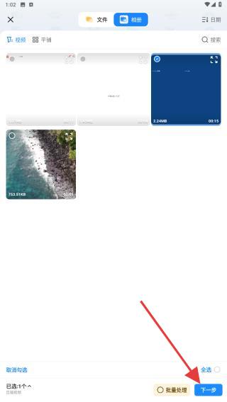 2、進入文件選擇界面后,勾選需要壓縮的視頻文件,支持單段或多段視頻,確認后點擊右下角下一步。