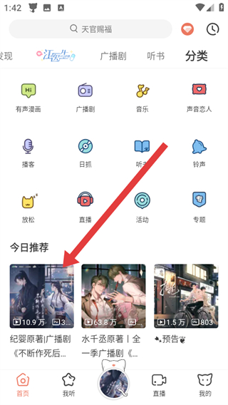 1、打開貓耳FM,在首頁選擇自己想要下載的音頻并點擊進(jìn)入播放界面。