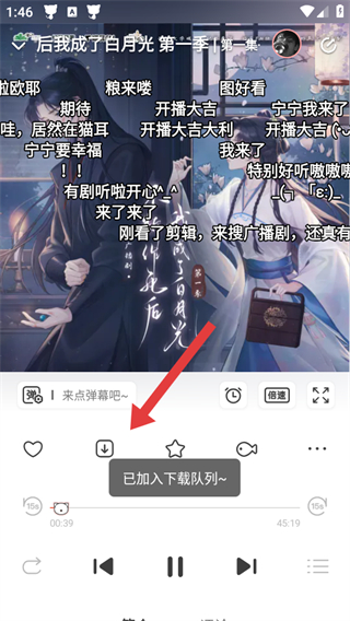 2、在音頻播放的界面,點擊下載的圖標(biāo),會彈出已加入下載隊列的提示,音頻開始下載。