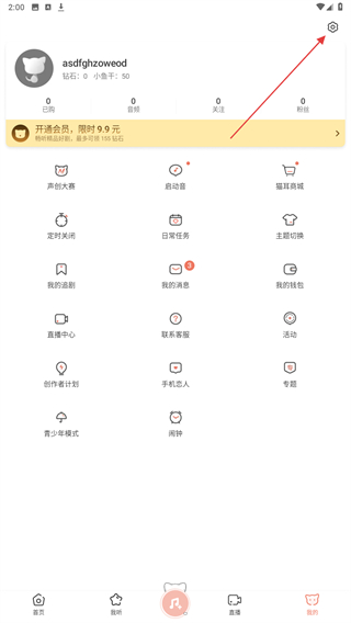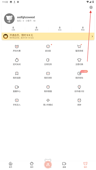 2、進(jìn)入我的頁面內(nèi),用戶需點擊右上角設(shè)置的功能圖標(biāo)。