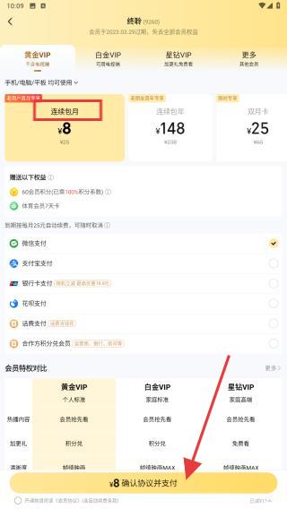 3、在會員套餐選擇頁面,找到連續(xù)包月的選項,再點擊底部確認協(xié)議并支付的按鈕即可。