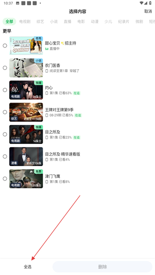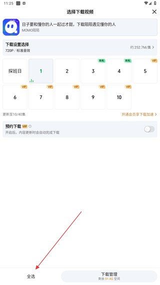 4、在選擇下載視頻的頁面內(nèi),點擊下方全選的按鈕即可。