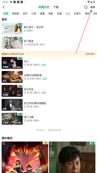 2、進入觀看歷史的頁面內(nèi),點擊右上方編輯的按鈕。