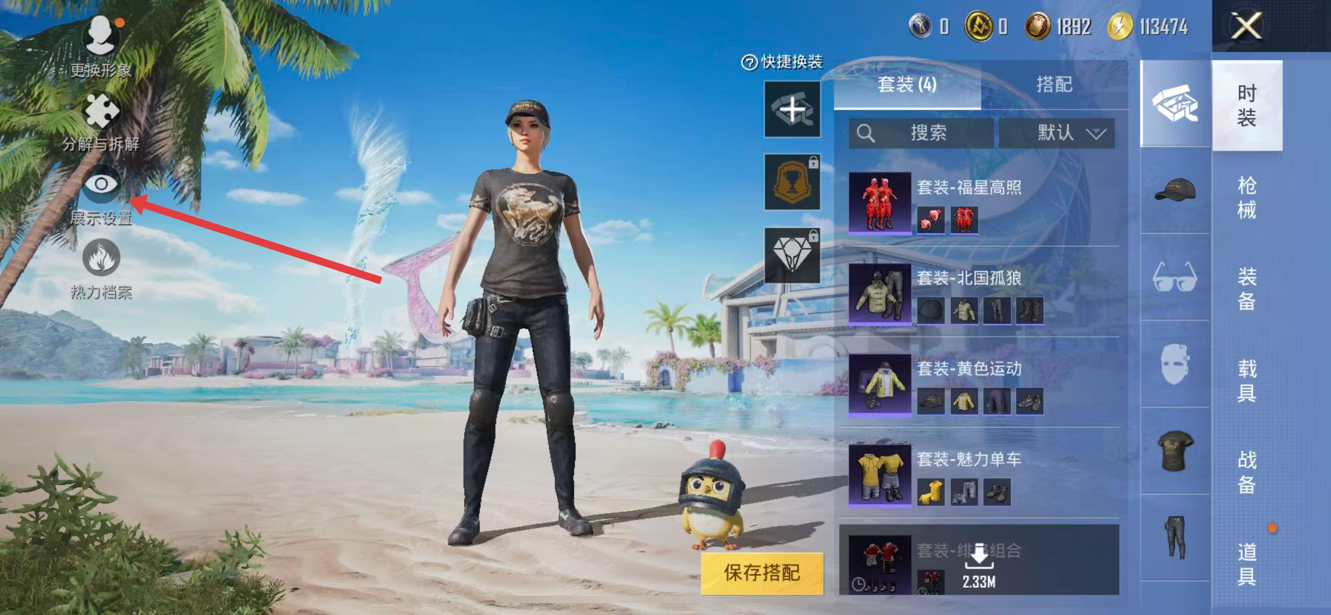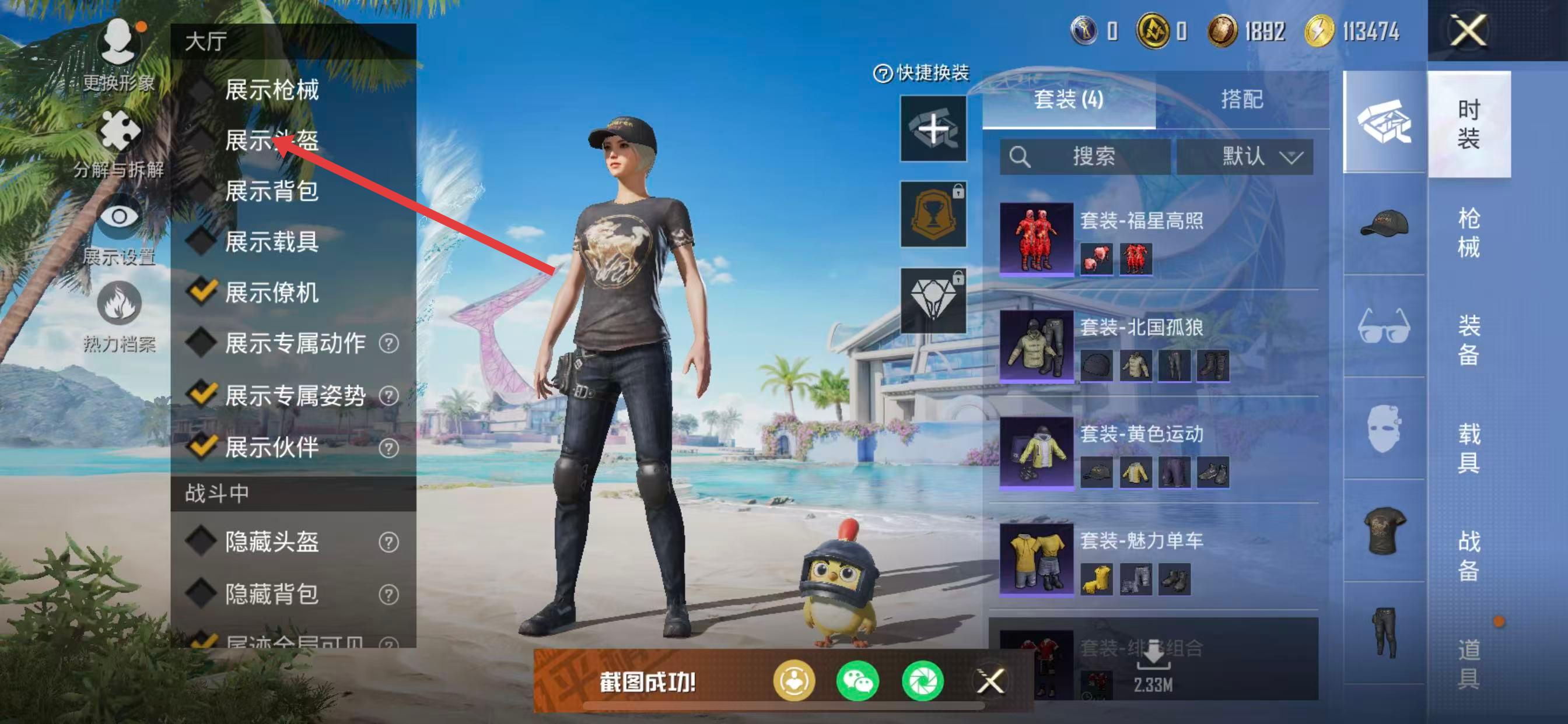 3、在展示設(shè)置菜單中,找到隱藏頭盔選項,勾選該選項,即可設(shè)置頭盔隱藏起來。