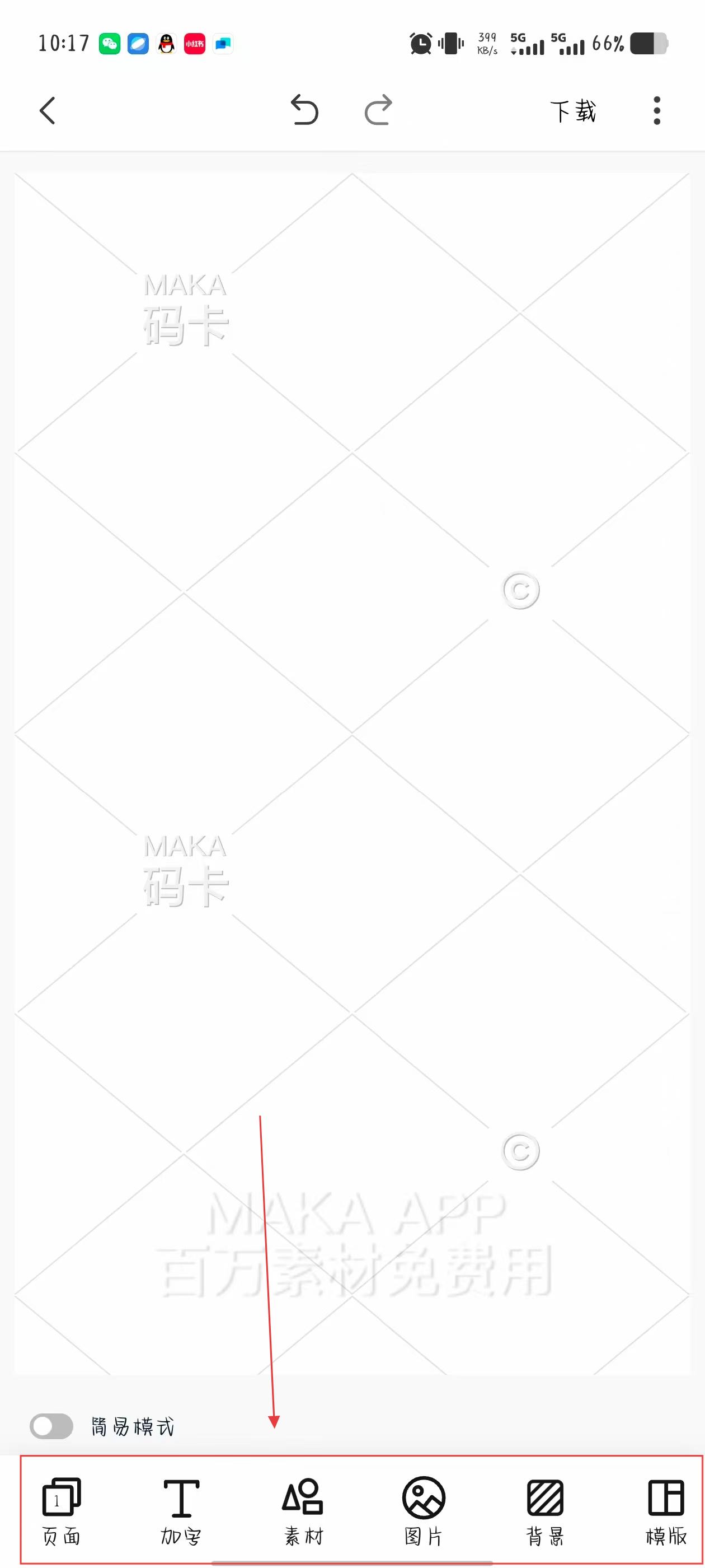 3、進(jìn)入編輯界面后,借助底部功能按鈕,添加內(nèi)容并調(diào)整設(shè)計(jì)。