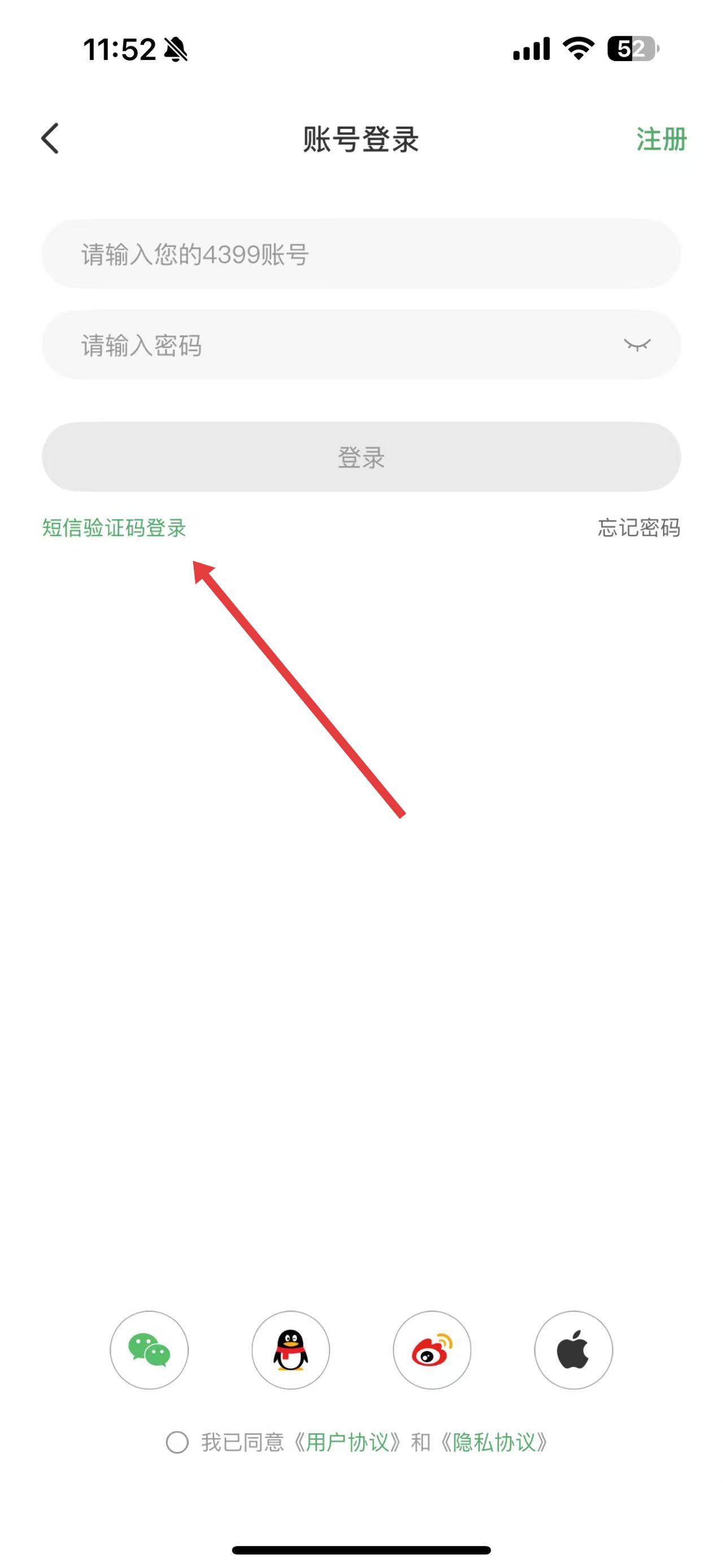 2、在賬號(hào)登錄界面,點(diǎn)擊短信驗(yàn)證碼登錄選項(xiàng),進(jìn)入短信驗(yàn)證碼登錄頁(yè)面。