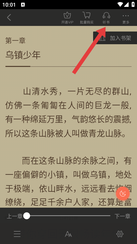 4、在小說閱讀界面中,點擊屏幕上方的聽書按鈕,即可開始聽書。
