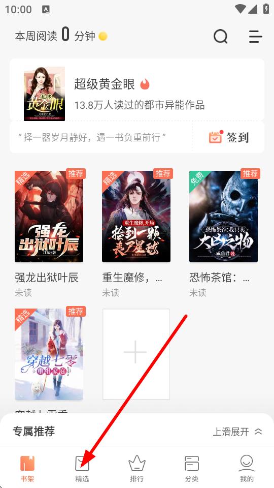 1、打開快看小說閱讀app,點擊底部導航欄中的精選進入推薦頁面。