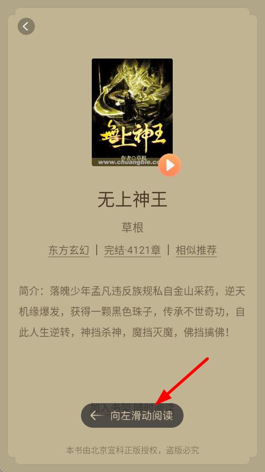 3、進入小說介紹頁面后,向左滑動閱讀,進入小說閱讀界面。