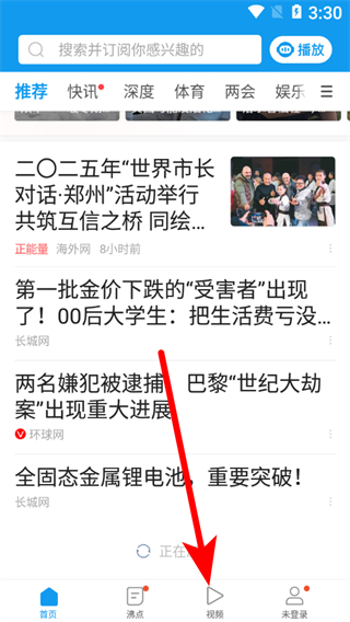 1、在新聞資訊app首頁,點(diǎn)擊下方視頻選項(xiàng),進(jìn)入視頻頁面。