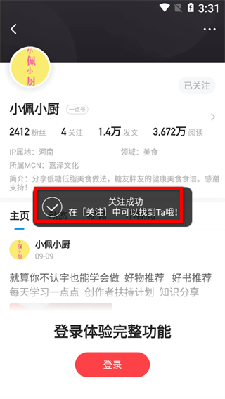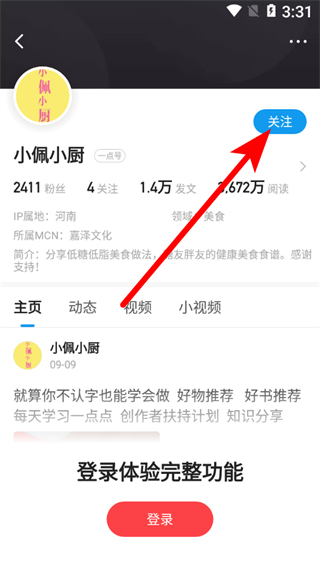 3、在創(chuàng)作者個(gè)人主頁,點(diǎn)擊關(guān)注按鈕,即可完成關(guān)注操作。