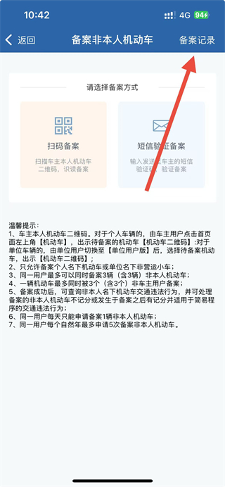 3、在備案非本人機(jī)動(dòng)車頁面點(diǎn)擊右上角備案記錄選項(xiàng)。