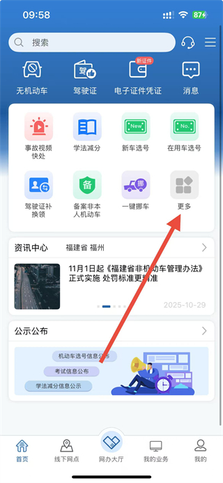 1、打開交管12123APP,在首頁點(diǎn)擊更多進(jìn)入業(yè)務(wù)中心。