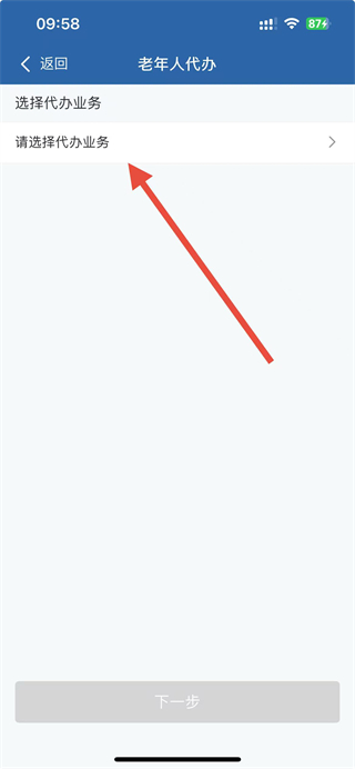 3、進(jìn)入老年人代辦頁面后,點(diǎn)擊請(qǐng)選擇代辦業(yè)務(wù)選項(xiàng)。