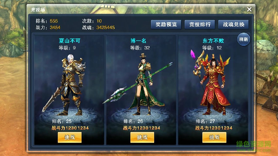 玩家每天的挑戰(zhàn)次數(shù):10次,被挑戰(zhàn)方排名需比挑戰(zhàn)方高,被挑戰(zhàn)的人不能同時(shí)被其他人挑戰(zhàn),如果被挑戰(zhàn)的人排名有變動(dòng),則需要重新刷新才能挑戰(zhàn);