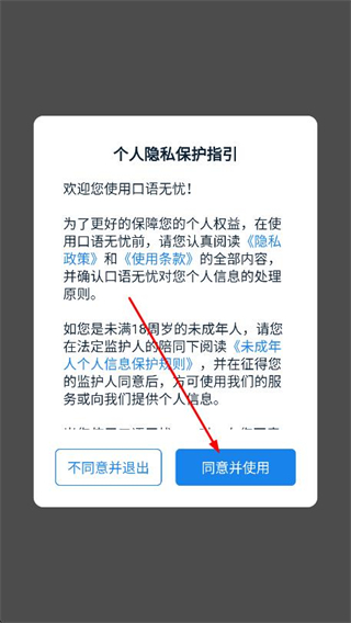 1、打開(kāi)口語(yǔ)無(wú)憂,在彈出的提示框中點(diǎn)擊同意并使用。