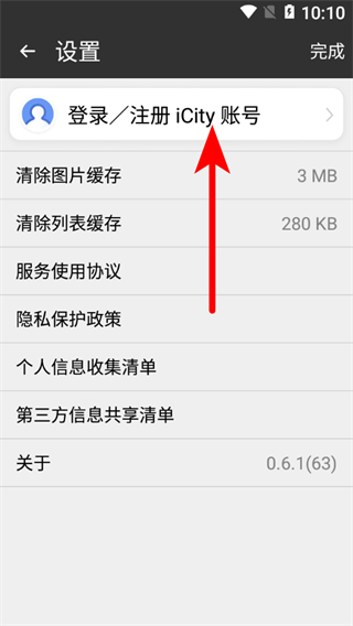2、點(diǎn)擊登錄/注冊(cè)iCity賬號(hào)選項(xiàng),進(jìn)入賬號(hào)操作頁(yè)面。