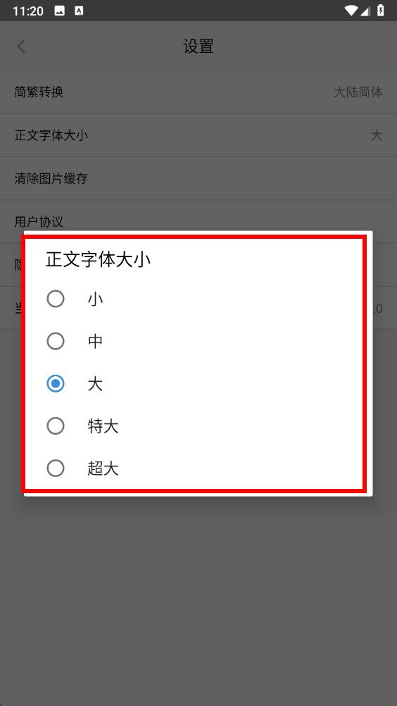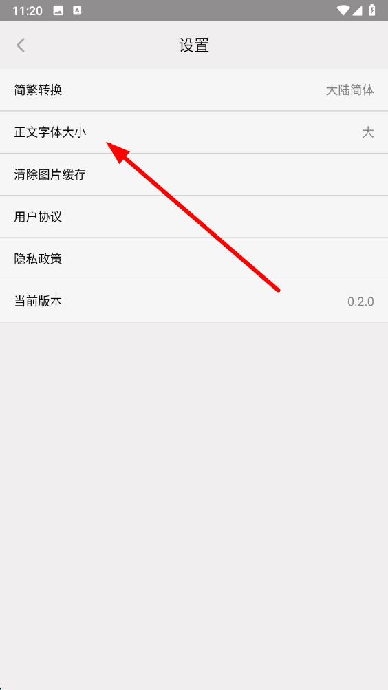 3、在設(shè)置界面里,找到正文字體大小選項并點擊。