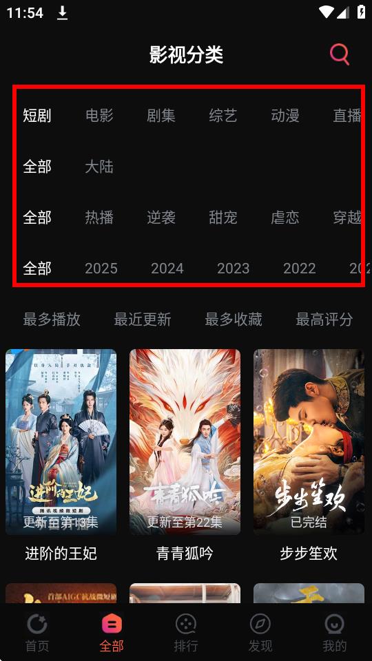 2、在影視分類頁面,根據(jù)短劇、電影、劇集等類別,以及地區(qū)、題材、年份等條件篩選影片。