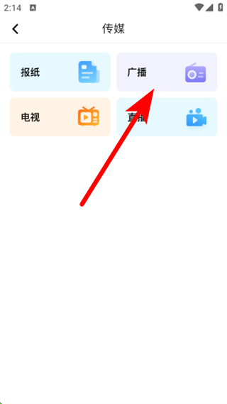 2、在傳媒的頁(yè)面,需要點(diǎn)擊廣播的選項(xiàng),進(jìn)入廣播的頁(yè)面。