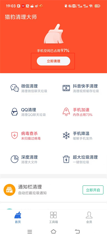 1、第一步先是點擊屏幕中間的【立即清除】即可可以展開自己的手機(jī)垃圾清除任務(wù);
