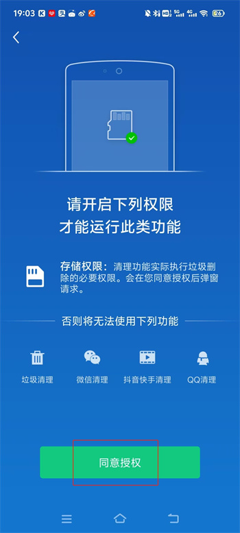2、隨后就會需要讓你同意軟件的權(quán)限管理,可以更加深入的對手機(jī)進(jìn)行清除,點擊下面的【同意授權(quán)】進(jìn)行授權(quán);
