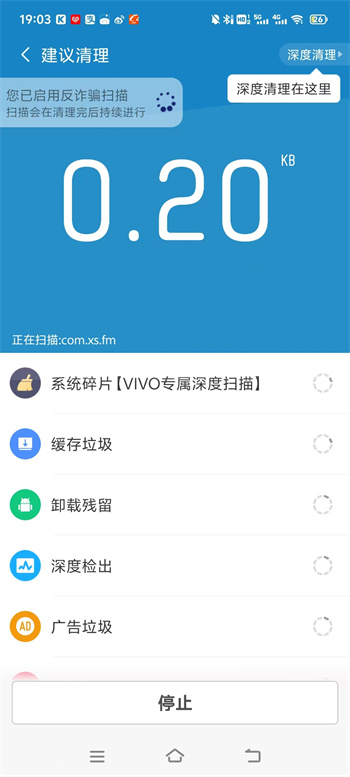 3、然后你的軟件便會來到自動掃描的頁面中,將所有手機(jī)中的垃圾全部都掃描出來,中間可以點擊下方的【停止】隨時終止自己的清除任務(wù);