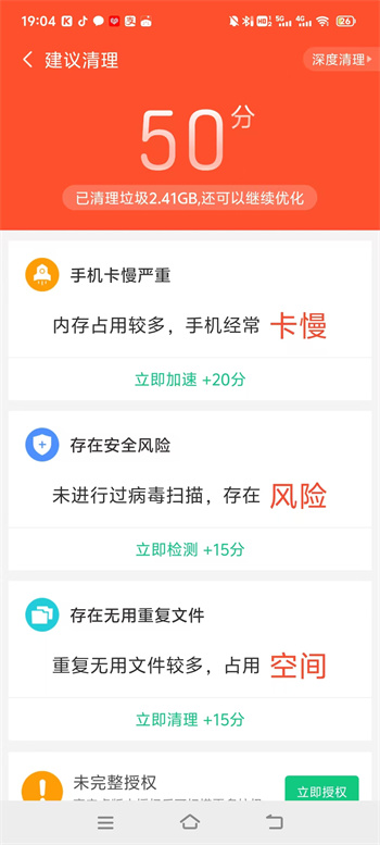 5、之后就可以完成自己的清除任務(wù),了解這個軟件為自己手機(jī)打的評分;
