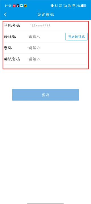 4、點擊發(fā)送驗證碼按鈕,輸入驗證碼,輸入密碼并再次輸入確認密碼。