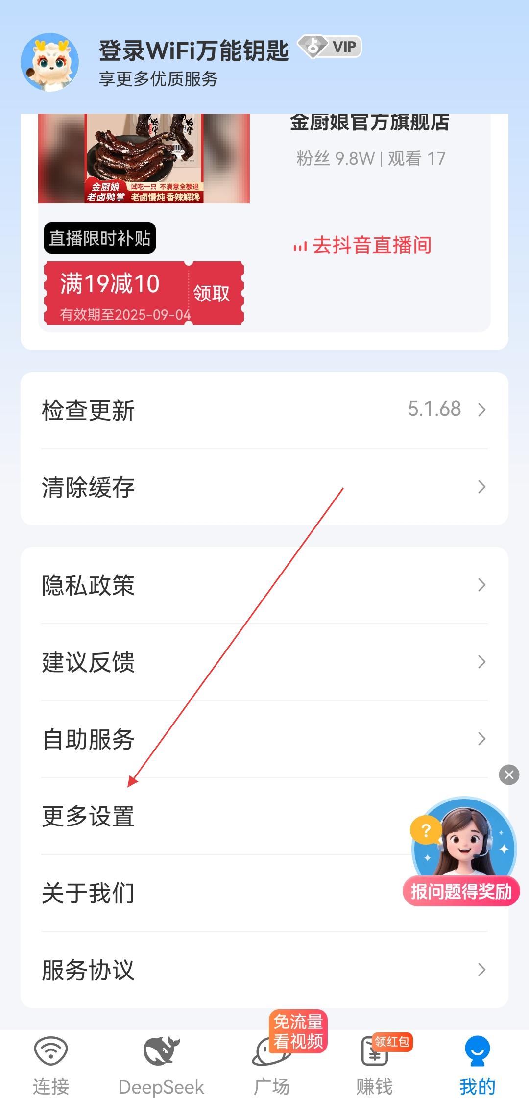 1、打開WiFi萬能鑰匙,進(jìn)入我的頁面,找到并點(diǎn)擊更多設(shè)置,進(jìn)入設(shè)置相關(guān)界面。