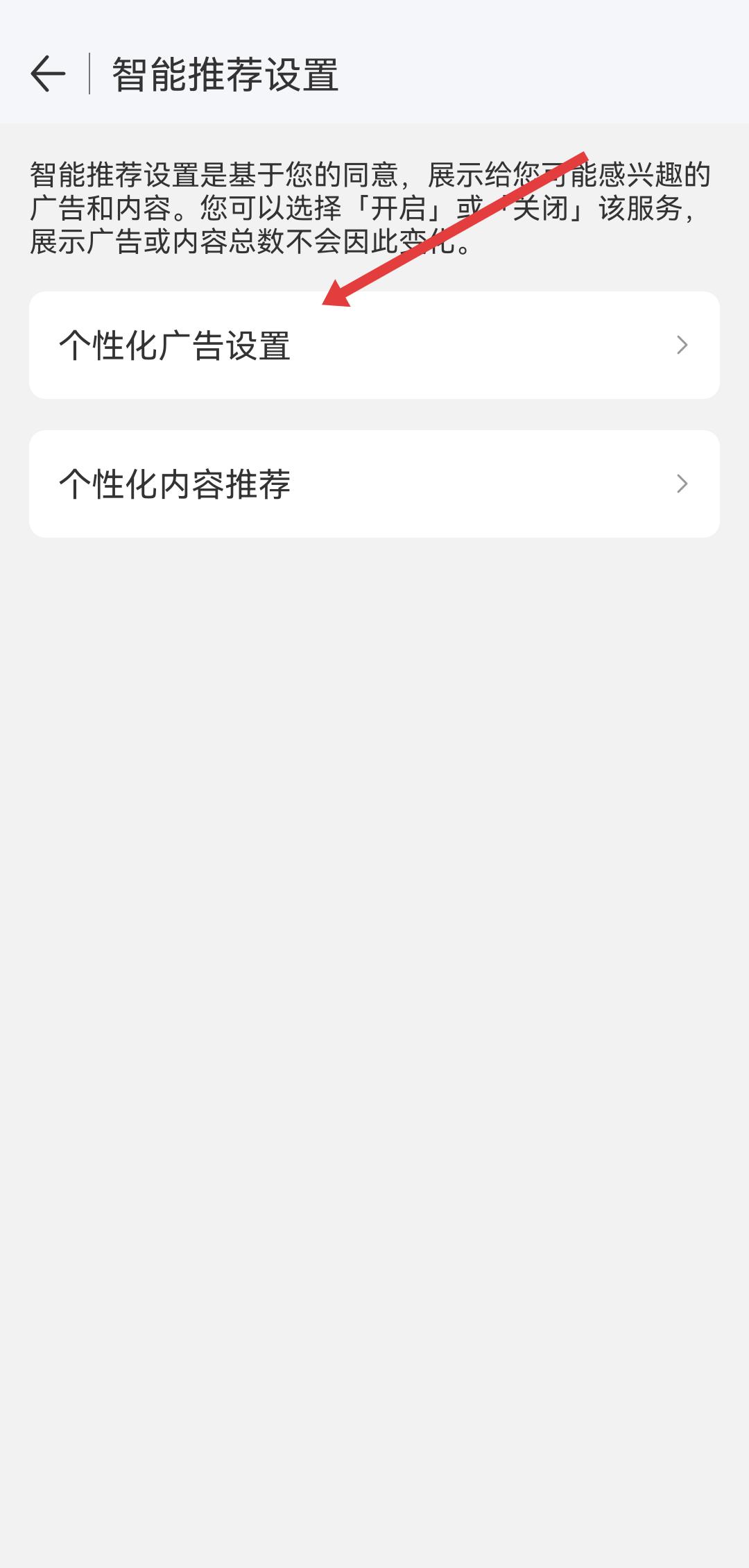 3、在智能推薦設(shè)置頁面里,點(diǎn)擊個(gè)性化廣告設(shè)置,進(jìn)入后可以關(guān)閉個(gè)性化廣告的開關(guān)。