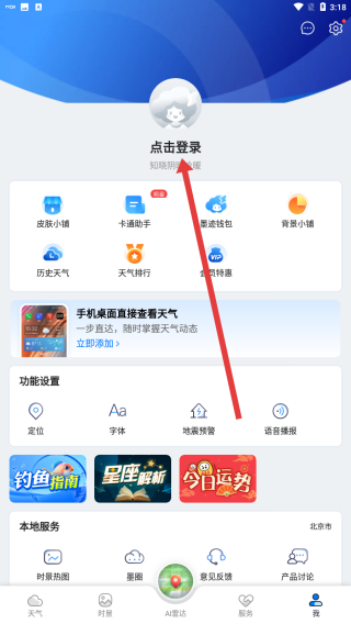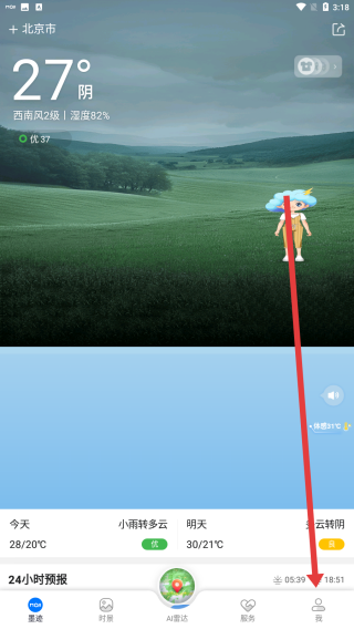 1、在墨跡天氣app首頁(yè)中,點(diǎn)擊右下角按鈕可以進(jìn)入到我的主頁(yè)。