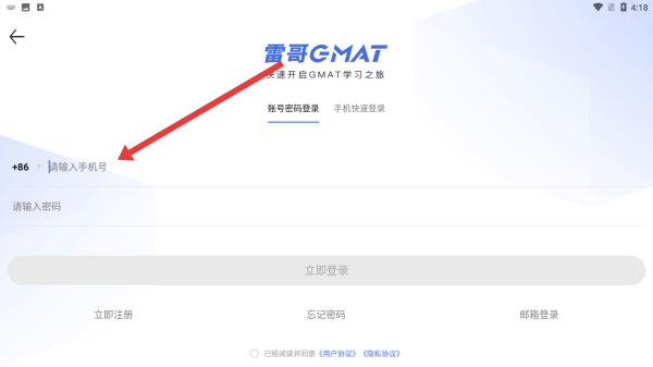 3、在雷哥GMAT登錄頁(yè)面中,點(diǎn)擊輸入框依次填寫(xiě)手機(jī)號(hào)和密碼完成登錄操作。