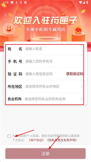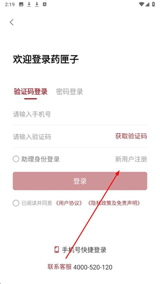 2、進(jìn)入登錄頁面后點擊新用戶注冊在注冊頁面,輸入姓名、手機號,點擊“獲取驗證碼”并填入短信驗證碼,選擇所在地區(qū)和執(zhí)業(yè)機構(gòu)。